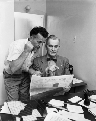 Pair Of Winners - M. M. McKnight, linotype operator, elected mayor pro term by the City Council to which he was recently reelected, points out a news story to Joe S. Rieser, ad room printer, elected to Benbrook's City Council.