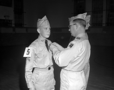 Outstanding Cadet - Cadet Corp. Gene Jenkins, Polytechnic High School Reserve Officers' Training Corp (ROTC) member, named Fort Worth's outstanding military cadet Tuesday night, is awarded a gold medal by Captain Robert Foster, president of the Reserve Officers Association.