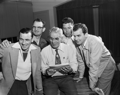 Handley Minstrel - Pictured are some members of the Handley Dad's Club who will be in the cast of a club minstrel at 8 p.m. Friday [April 17, 1953] and Saturday [April 18, 1953] at Handley High School auditorium. They are, left to right, Nova Howard, Joe Kunze, Lewis Alvis, Marvin Harris and Bill Hill. Clipping reads: "Fathers of Handley Elementary School students who are organized in a Dad's Club will present a minstrel Friday and Saturday nights to raise funds for their children's classrooms...Money will be used to add to school room's equipment and supplies that the school does not provide." Published in the in the Fort Worth Star-Telegram morning edition, April 15, 1953.