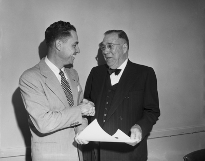50-Year Award - Joe Alfrod of Dallas, left, executive secretary of the American Institute of Minig and Metallurgical Engineers, at Western Hills Hotel presented to S. M. Greenidge of Fort Worth the Legion of Honor for 50 years of active membership. Greenidge is retired from Texas Pacific Coal & Oil Company.