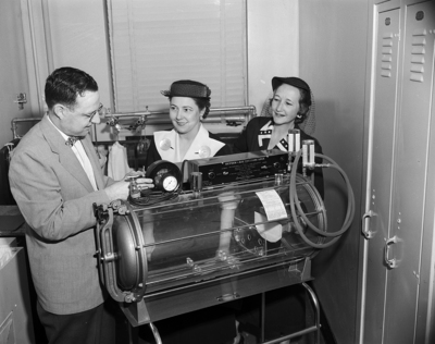 Lowell Hudson, administrator of City-County Hospital, demonstrates the operation of an air lock respirator recently presented to the hospital by Fort Worth Women of Rotary to Mrs. V. W. Boswell, center, special funds chairman, and Mrs. Frank C. A. Clayton, right, social service chairman of Women of Rotary.