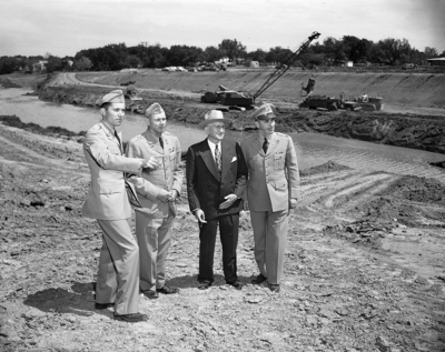 Flood Fighters - Machines and men busily carving out Fort Worth's floodway project on the Trinity River Wednesday when Major General Samuel D. Sturgis Jr., new chief of the Army Corps of Engineers, inspected this area near E. 4th Street Bridge. Colonel H. R. Hallock, left, Fort Worth district engineer, points out other project phases to, left to right, General Sturgis, John M. Fouts, general manager of Trinity Improvement Association, and Colonel Herbert D. Vogel, Southwestern division engineer at Dallas.