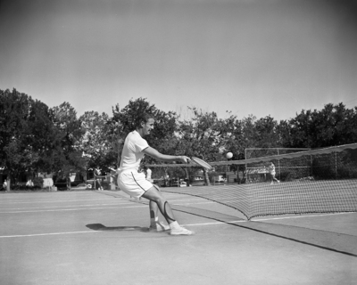 Champion In Action - Bill Hunnicutt of Amon Carter Riverside, defending city high tennis champion, returns a shot in his semifinals match against Bill Davis of Arlington Heights. Hunnicutt won and will meet Paul Pendergrass of Paschal in finals.