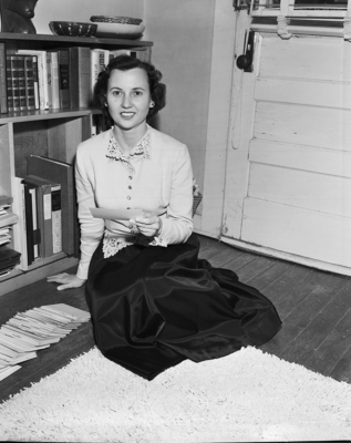 Miss Pauline Rippy, an instructor at Texas Christian University spent the summer working under a grant-in-aid from the Carnegie Foundation, writing a book on Oil Field language. Miss Rippy traveled hundreds of miles over Texas oil country compiling data for her research from men in the fields. Miss Rippy sits on the floor at the center of the image.