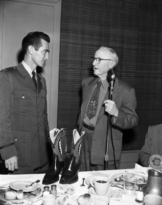 First Boots - Colonel Royal N. Baker, ranking jet ace, gets first pair of cowboy boots from C. H. Leonard, Daily Register publisher, acting for Miss Enid Justin of Nocona, at service club luncheon marking opening of Gainesville Community Circus season.