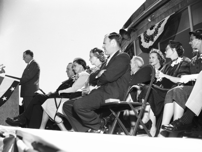 The opening of the Greater Fort Worth International Airport. A group of men and women are sitting and listening to a man speak at a podium on the far left of the image. In the front row of seated people, from left to right, are an unidentified woman and man, Minnie Meacham Smith Carter, and Amon Carter, Jr. The airport is also known as the Greater Southwest International Airport and Amon Carter Field.