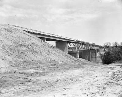 The image shows a bridge at Kimbal"Kimbal Bendl Bend near Cleburne, Texas. The bridge was 1,295 feet long and covered an area of the Brazos River that was once a crossing spot for cattle drives.