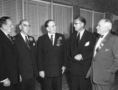 The opening of the Greater Fort Worth International Airport. A group of five men having a discussion at the event. Two of the men have corsages with ribbons labelled "Committee" pinned to their lapels. The airport is also known as the Greater Southwest International Airport and Amon Carter Field.