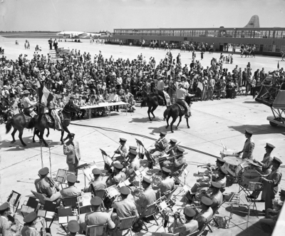 The opening of the Greater Fort Worth International Airport. A group of cowboys are riding horses outside of the airport terminal. A large number of spectators are standing or seated in chairs watching the proceedings. In the foreground is the Carswell Air Force Base Band. In the distance there are two parked airplanes. The airport is also known as the Greater Southwest International Airport and Amon Carter Field.