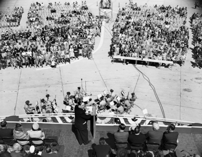 The opening of the Greater Fort Worth International Airport. An standing man at a podium with a microphone is looking to his right at a seated man. The speaker is on a terrace with people seated behind him. The shot is from behind the speaker and facing a large group of seated spectators listening to the speach. Below the speaker at the ground level is a military band. The airport is also known as the Greater Southwest International Airport and Amon Carter Field.