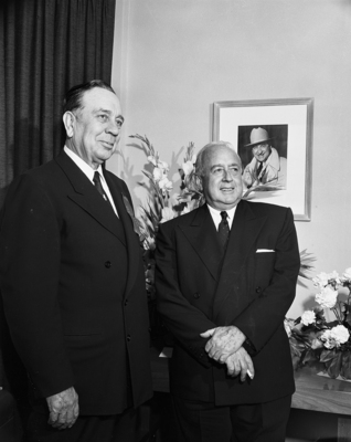 The opening of the Greater Fort Worth International Airport. Two men are standing in front of a desk with flower arrangements. Behind the desk is a photograph of Amon G. Carter. The airport is also known as the Greater Southwest International Airport and Amon Carter Field.