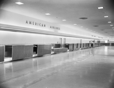 The opening of the Greater Fort Worth International Airport. A shot of inside the terminal where customers submit their suitcases for the flight. There are three women in the distance. There are signs for American Airlines, Braniff Airways, and Pioneer Airlines. The airport is also known as the Greater Southwest International Airport and Amon Carter Field.