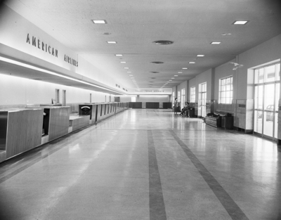 The opening of the Greater Fort Worth International Airport. A shot of inside the terminal where customers submit their suitcases for the flight. There are three women in the distance. There are signs for American Airlines, Braniff Airways, Pioneer Airlines, and Trans - Texas Airways. The airport is also known as the Greater Southwest International Airport and Amon Carter Field.