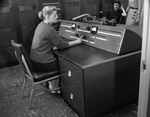 The opening of the Greater Fort Worth International Airport. A woman is seated at a desk with a panel of knobs and switches. There is also a microphone in front of her. Two women are in the background. The airport is also known as the Greater Southwest International Airport and Amon Carter Field.