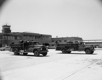 The opening of the Greater Fort Worth International Airport. A shot of two Fort Worth Air Terminal, Inc. fire trucks. In the background is the terminal and control tower. The airport is also known as the Greater Southwest International Airport and Amon Carter Field.