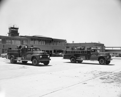 The opening of the Greater Fort Worth International Airport. A shot of two Fort Worth Air Terminal, Inc. fire trucks. In the background is the terminal and control tower. The airport is also known as the Greater Southwest International Airport and Amon Carter Field.
