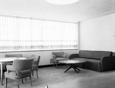 The opening of the Greater Fort Worth International Airport. Interior shot of a large round room with chairs and couches. The is a window along the back wall that covers the whole length of the wall. The airport is also known as the Greater Southwest International Airport and Amon Carter Field.