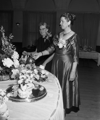Mrs. A. B. Pumphrey, right, Woman's Club garden department chairman, and Mrs. Wiltie Creswell, left, staging chairman, are shown with some of the arrangements in the department's flower and table show in Anna Shelton Hall Thursday.
