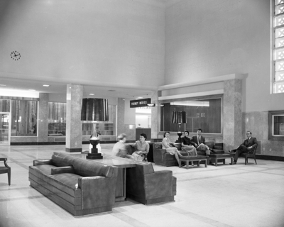 Restful Waiting Room - The lobby of the Greater Fort Worth International Airport which provide a restful atmosphere unlike the usual waiting room. The lobby is 180 feet long, 60 feet wide and has a 31-foot ceiling. Shops and window displays surround the lobby. On the east wall, above the entrance to the dining room and coffee shop is a mural depicting the history of Texas. Concourses are easily reached from the lobby.