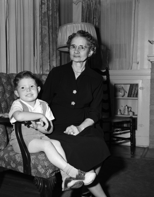 Mrs. Roy Douglas, 3233 University Drive, new president of the University Place Art Club, is shown with her grandson, Randy, who lives at 2821 W. Bewick. Published in Fort Worth Star-Telegram morning edition May 8, 1950.