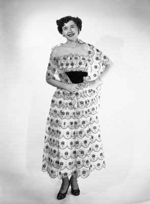 Pattie O'Dell, a Paschal High School graduate, stands modeling a spring formal from The Fair. Pattie is wearing a popular short-styled evening gown of white organdy with a flower scroll design. Published in the morning edition, April 23, 1950.