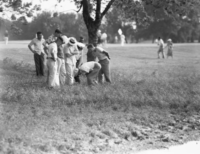 Lloyd Mangrum bends to peer closely at a ball buried in the mud in the rough off the 18th fairway. Seconds later, satisfied that it was his, he declared the lie unplayable, took a penalty stroke.
