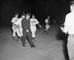 Umpire S. J. LeCamus leads the parade as he walks away from an argument with three Dallas Eagles Wednesday night. The players, left to right, are Ben Taylor, Jodie Beeler and manager L. D. Meyer. They are insisting that Cat runner Gale Wade (not shown) should have been called out for running outside the base lines to avoid a tag. LeCamus didn't see it that way.
