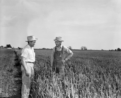 Growth of this Early Triumph wheat was aided through applications of 10-10-0 fertilizer and ammonium nitrate. County Agent Wylie Roberts, left, and J. R. Brown inspect the wheat.