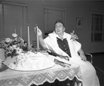 Mrs. Dora Roberts celebrating 90th birthday sitting next to cake and lighting a candle, 04/23/1953