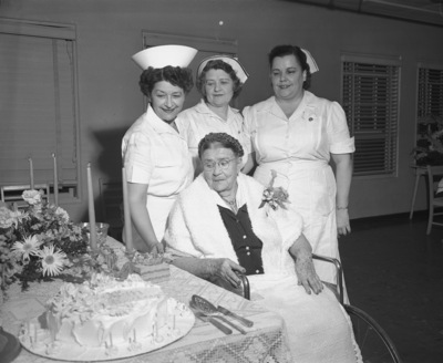 Mrs. Dora Roberts celebrating 90th birthday sitting next to table with 3 nurses standing behind her, 04/23/1953