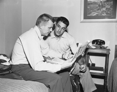 Tom Tatum (left), Oklahoma City manager, checks a box score with his new pitcher, Angelo Nardella. The Indians and Cats, rained out Thursday night, are scheduled for an 8 p. m. final Friday at La Grave.