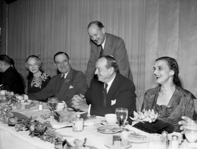 Greater Fort Worth Texas International Airport opening. At dinner table, Left to right, Mrs. Amon Carter, Harold E. Talbott, C. R. Smith, Sid Richardson and Mrs. Harold Talbott.