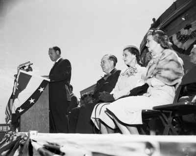Greater Fort Worth Texas International Airport opening. Amon Carter Junior, representing his father, speaking at dedication. Others on platform are Raymond Buck, Mrs. Harold E. Talnott and Mrs. Amon carter.