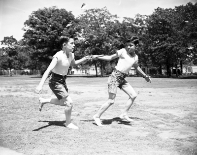 Ernest Taylor and Ronnie Cartwright practicing for the annual city elementary schools relays. They are students of Oak Knoll.