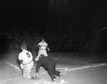 Mickey Rutner, background, seems to be enjoying things as Umpire Len Roberts heads for the ground after being in collision with Zip Zunno (5) of the Indians at home plate. This happened in first inning of Oklahoma City-Cat game at La Grave Field Friday night.