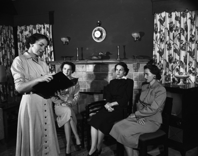 Series on the Woman's Auxiliary to the Tarrant County. Mrs. J. R. Cochran, standing, retiring president, goes over plans for the new program with, left to right, Mmes. T. M. TrimbleII, M. C. McCarroll and R. V. Price.