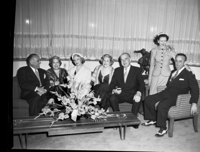 Greater Fort Worth Texas International Airport opening. Group that greeted first passengers, Left to Right, T. patrick Carr, Mrs. Carr, Mrs. Amon carter, mrs. Bruno K Graf and Mr. Graf.