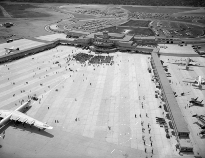 Opening of the Greater Fort Worth International Airport. The air view was taken during the dedication showing a small portion of a crowd of 30,000. In the left foreground is a B-36.