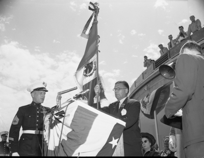 Robert F. Windfohr holds flag of Mexico during dedication of the Greater Fort Worth International Airport. Technician Sergeant Thomas C. Rogers of the Marine Air Detachment, Grand Prairie Naval Air Station, stands beside Windfohr.