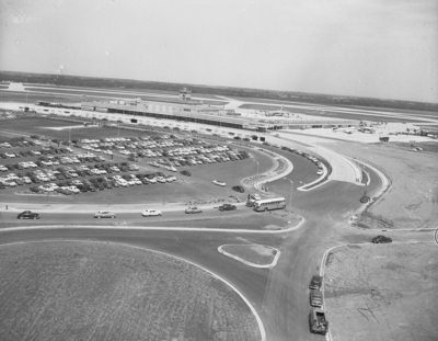 Airview of car pouring into the parking areas at the airport before opening ceremony