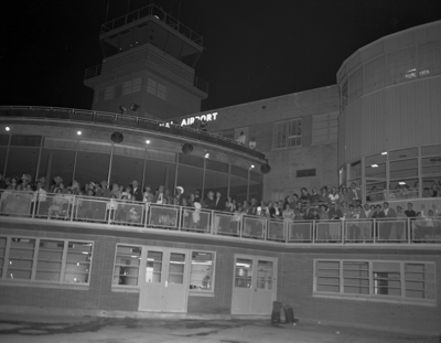 Part of crowd in shown waiting for plane on the terrace of the dining room of the terminal building