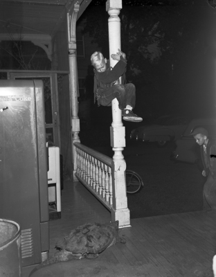 Jeffery Ross, 8, climbs to a safe post to view 100-pound snapping turtle that was given to the museum