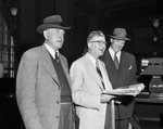 Officials of two of the largest oil firms on hand for the oppening session of the spring directors meeting of the American Petroleum Institute Wednesday at Hotel Texas. Left is Eugene Holman, president of Standard Oil Company of New Jersey, world's largest oil company. Center is Hines H. Baker, president of Humble Oil & Refining Company, largest domestic producer. On the right is M. J. Rathbone, director of Jersey Standard.