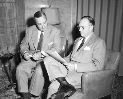 Top officials of the Gulf Oil Corporation were among directors of the American Petroleum Institute attending the spring board meeting last week at Hotel Texas. Sidney A. Swensrud, right, board chairman, discusses a problem with W. K. Whiteford, president.