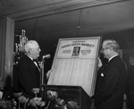 Lionel Bevan, right, presents the framed scroll of Exchange Club members' and guests' signatures to J. Lee Johnson Jr. at the conclusion of the Golden Deeds Banquet at which Johnson was honored as Fort Worth's outstanding citizen of 1949.