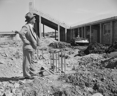 Texas Christian University (TCU) Athletic Director Dutch Meyer check progress on enlargement of Amon Carter Stadium's east stands.