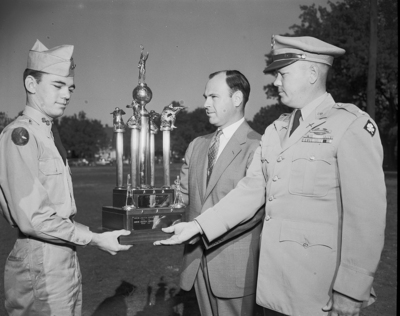 Left to right, Cadet Lieutanent Elton Jewett, Amon Carter Jr., and Major Edward E. Jordan