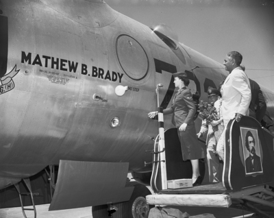 A/1C Lydia Osmond Christens photoreconnaissance plane Mathew B. Brady while Major General Samuel E. Anderson and Joseph Costa look on
