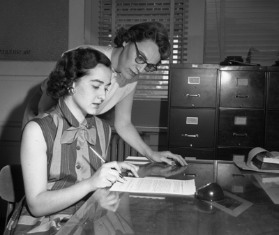 Miss Carrie Fenichis, seated, a third grade teacher in H. V. Helbing School, signs an oath declaring that she is not and has not been a member of the Communist Party, its affiliations or any other subversive organization. Miss Doris Stroud, notary public, witnesses her signature.