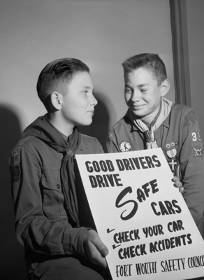 Two of the Fort Worth Boy Scouts who participated in the distribution of posters calling attention to the safety campaign being conducted through May under the co-sponsorship of the New Car Dealers Association and the Fort Worth Safety Council are, left to right, Pat Riley and David Nichols, members of Troop 32, Monsignor Nolan Council, Knights of Columbus.